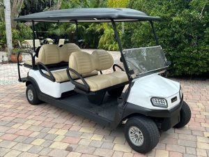 One of the most common golf cart brands is the Club Car golf cart, coming in a variety of sizes including 4 passenger and 6 passenger. There are several different models with different body styles and varying specifications, including the Club Car Tempo and Club Car Precedent. These carts are similar, and some parts like seats can be used for either, but the Tempo is a more modern version of the Precedent, with upgraded technology, battery configurations, and a different front body cowl.